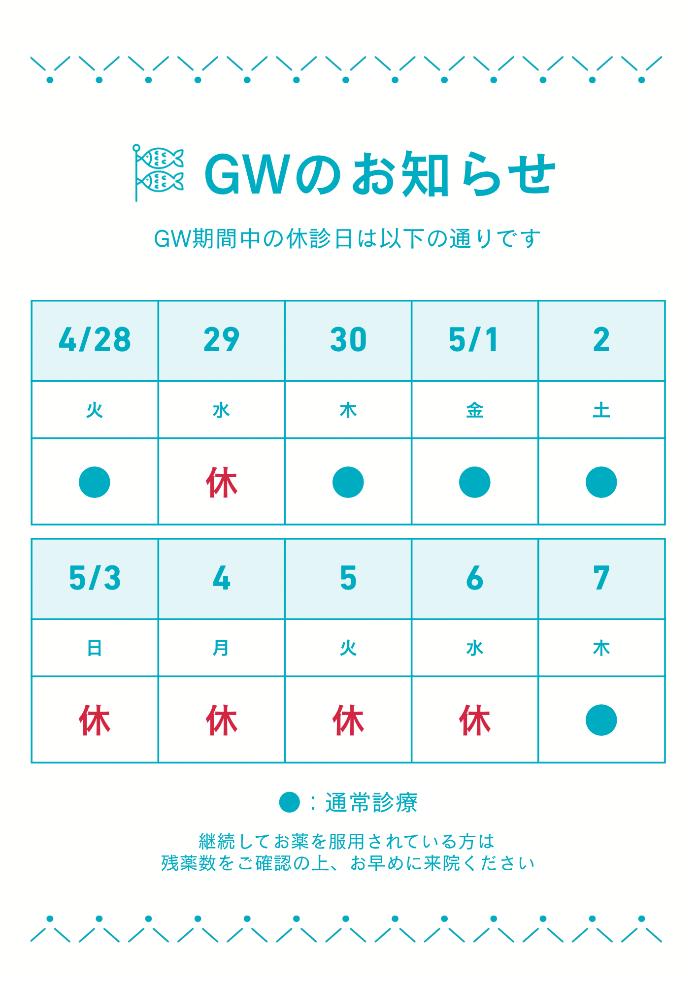 ゴールデンウィークの休診は以下の通りとなります。